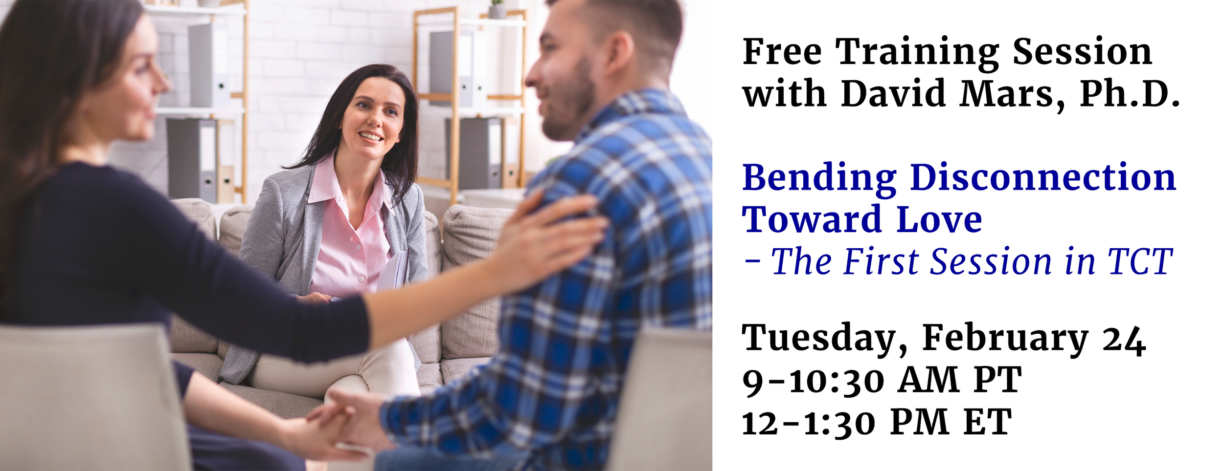 And you can learn new skills to start your next couples session at our FREE training session! – “Bending Disconnection Toward Love - The First Session in TCT” Tuesday, February 24, 12-1:30 PM ET. Free 1.5 CE for the first 150 participants.